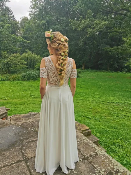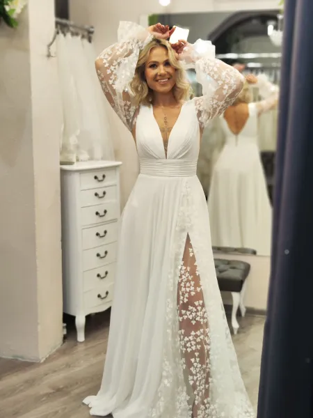Suknia ślubna w stylu boho to romantyczna i lekka propozycja, która doskonale sprawdzi się na ślubach plenerowych i w stylu rustykalnym. Jest idealnym wyborem dla kobiet ceniących naturalność i swobodę. Charakteryzuje się luźnym krojem, często wykonana jest z lekkich, przewiewnych materiałów, takich jak koronka, len czy bawełna. Jej unikalny charakter podkreślają hafty, frędzle, rozszerzane rękawy oraz delikatne aplikacje kwiatowe, które nadają jej artystyczny i romantyczny wygląd.