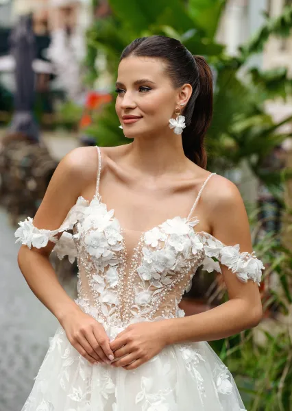 Suknia ślubna w stylu księżniczki, zwana także Princess lub Ball Gown, nadaje bajkowy charakter, podkreśla talię i maskuje biodra. Jest idealna dla pań o figurze klepsydry, gruszki i prostokątnej. Charakterystyczną cechą tej sukni jest obszerna, rozkloszowana spódnica, często wykonana z wielu warstw tiulu, które dodają jej objętości. Góra jest zazwyczaj dopasowana i usztywniona, często zdobiona haftami, perełkami czy kryształkami, nadając całości luksusowy wygląd.